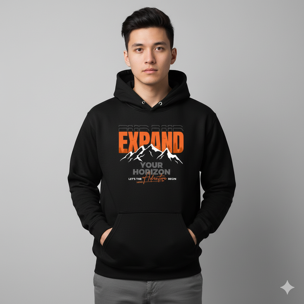 Step into new adventures with our Expand Your Horizon Hoodie. Designed with a bold mountain-inspired graphic and motivational typography, this hoodie is perfect for explorers, dreamers, and go-getters who believe in pushing beyond limits.