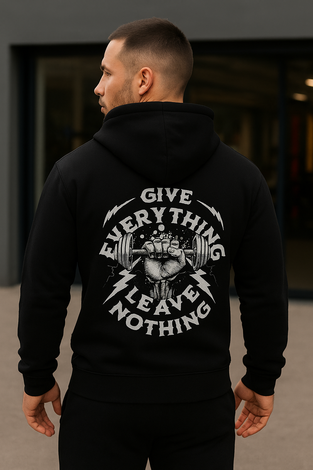 Push your limits with the Give Everything Leave Nothing Hoodie. Featuring a bold back print of a powerful fist gripping a barbell with lightning accents, this hoodie is designed for athletes, lifters, and fitness enthusiasts who give their all in every workout.