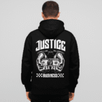 Striking “Justice Business” artwork featuring handcuffs gripping dollar bills.