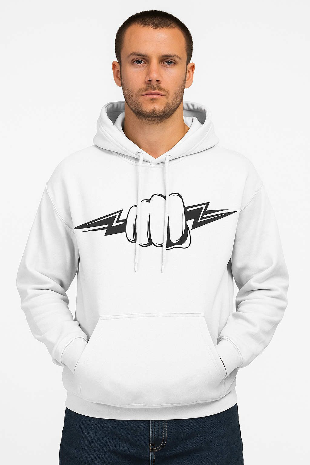 White hoodie featuring a bold fist and lightning bolt graphic, symbolizing strength and energy. A perfect blend of comfort and statement style.